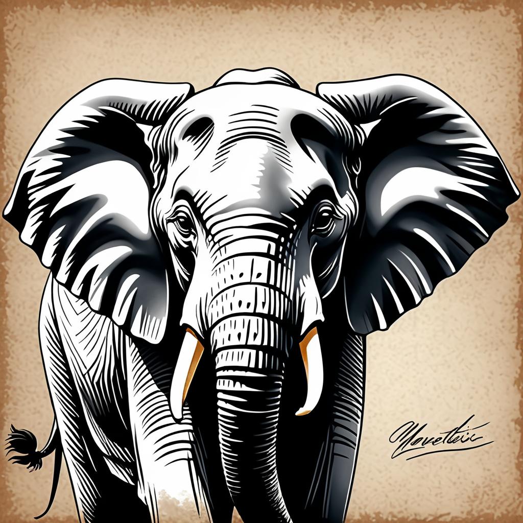Detailed black and white vintage-style portrait of a majestic elephant. The close-up illustration features expressive facial details and textured shading, rendered with a soft pencil sketch effect on an aged paper background.