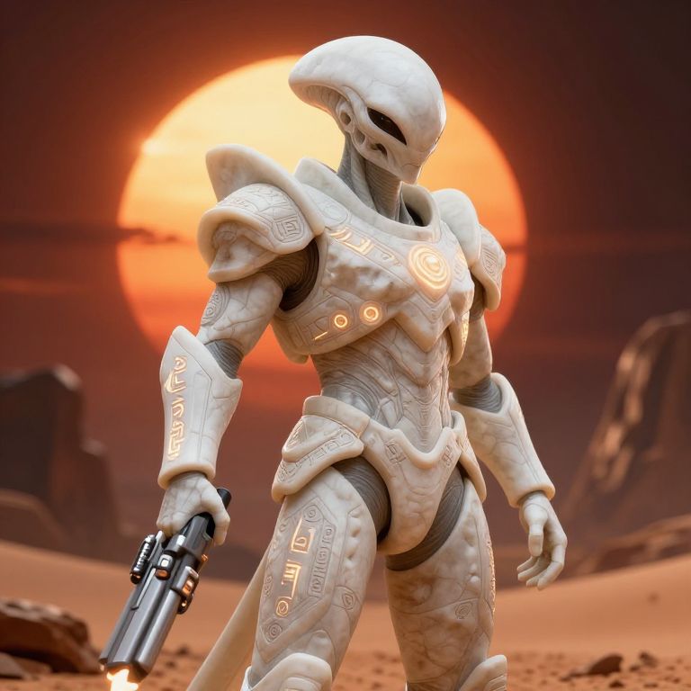 Marble alien warrior with glowing runes engraved on textured white stone skin, holding futuristic energy weapon, set against a dramatic alien desert landscape with twin suns, cinematic style