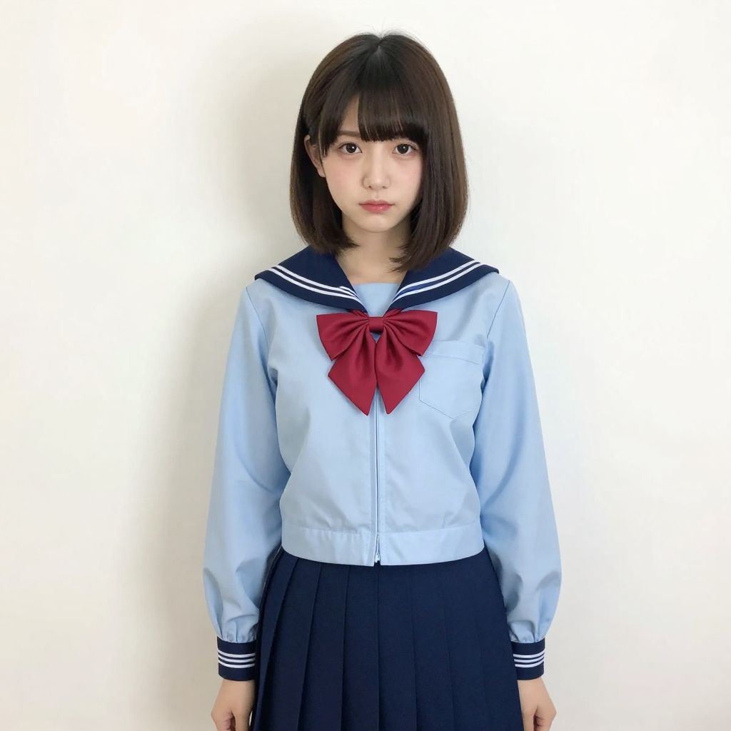 Photograph of an Asian teenage girl with fair skin and straight black hair, adorned with a red hair bow. She wears a light blue Japanese school uniform blouse with a large red bow at the neck, and a black pleated skirt with white trim. Her expression is neutral, and she stands against a plain white background. The image has a slightly overexposed, high-contrast style, emphasizing the colors of her outfit and hair accessories. The overall composition is centered and symmetrical.