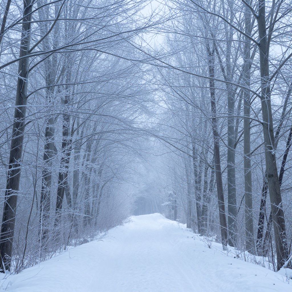 A serene winter forest scene featuring a snow-covered path flanked by tall, frosted trees with bare branches. The blueish hue creates a cold, misty atmosphere highlighting the stillness and beauty of the winter landscape.
