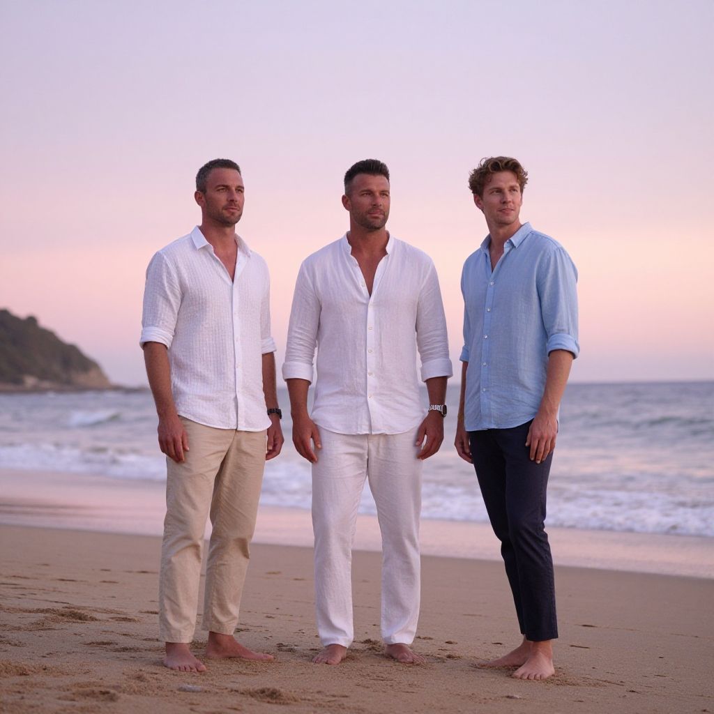 Tall handsome men enjoying a serene beach sunset, dressed in smart casual linen clothes, soft pastel sky, relaxed mood, scenic coastal landscape with gentle waves