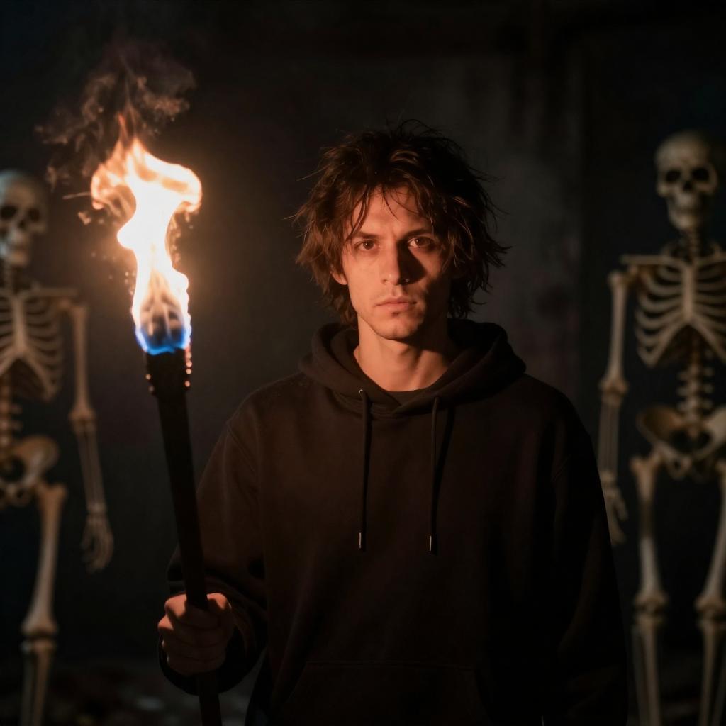 Photograph of a dark-haired man in a long black coat and black pants, crouching with one knee bent and one hand on the ground. He stands in a dimly lit, brick-walled cavern with a spotlight shining from above, illuminating his intense expression. Water drips from the ceiling, and two rectangular blocks are on the ground in front of him.