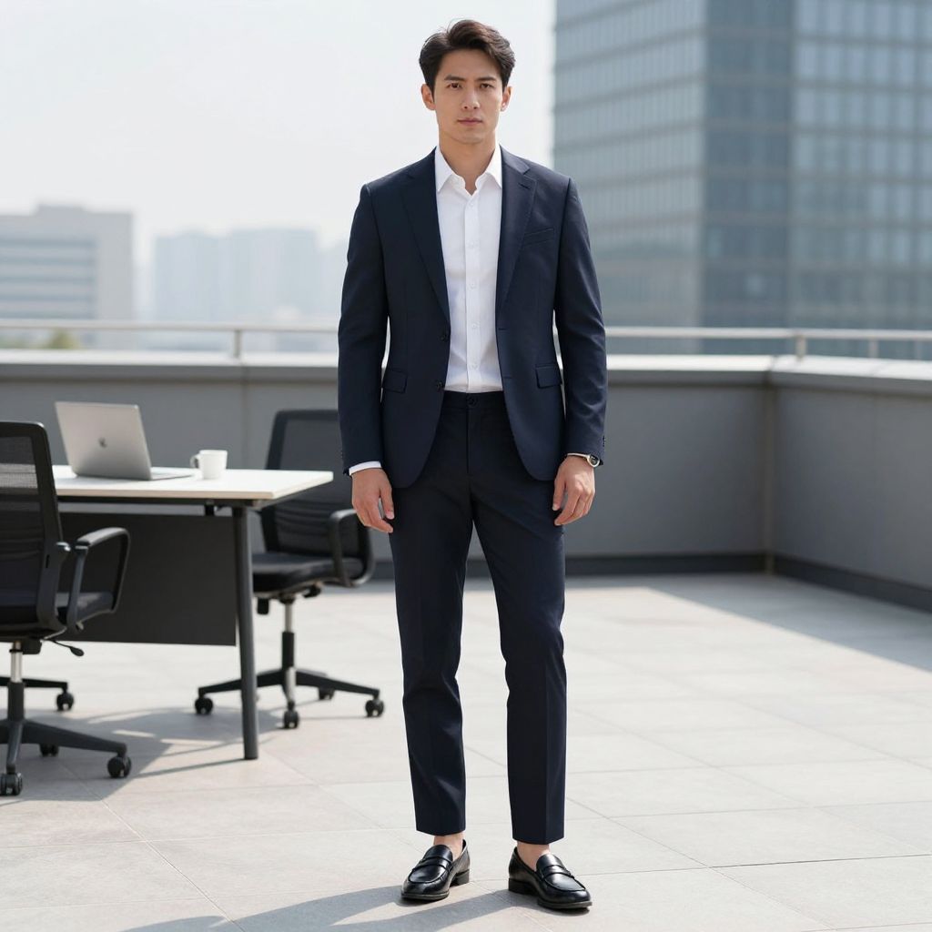 Photograph of a young Asian man in a black suit, white shirt, and black shoes standing confidently on a sunlit rooftop office terrace, with modern