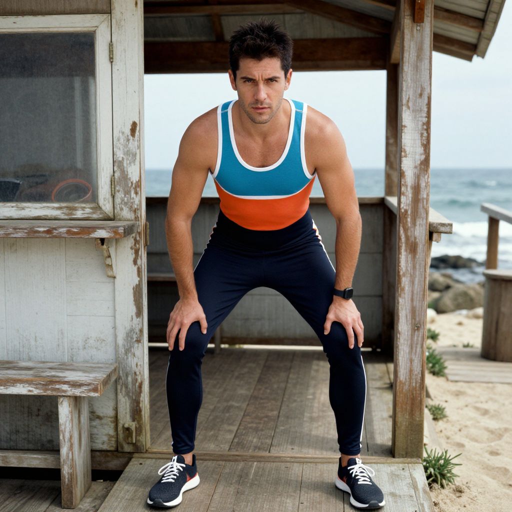 A man, black compression shirt, bright green performance shorts, cushioned tennis sneakers, sleek design, vibrant stalls, fresh produce, aromatic spices, technicolor analog film stock, focused expression. Man has masculine face and piercing eyes