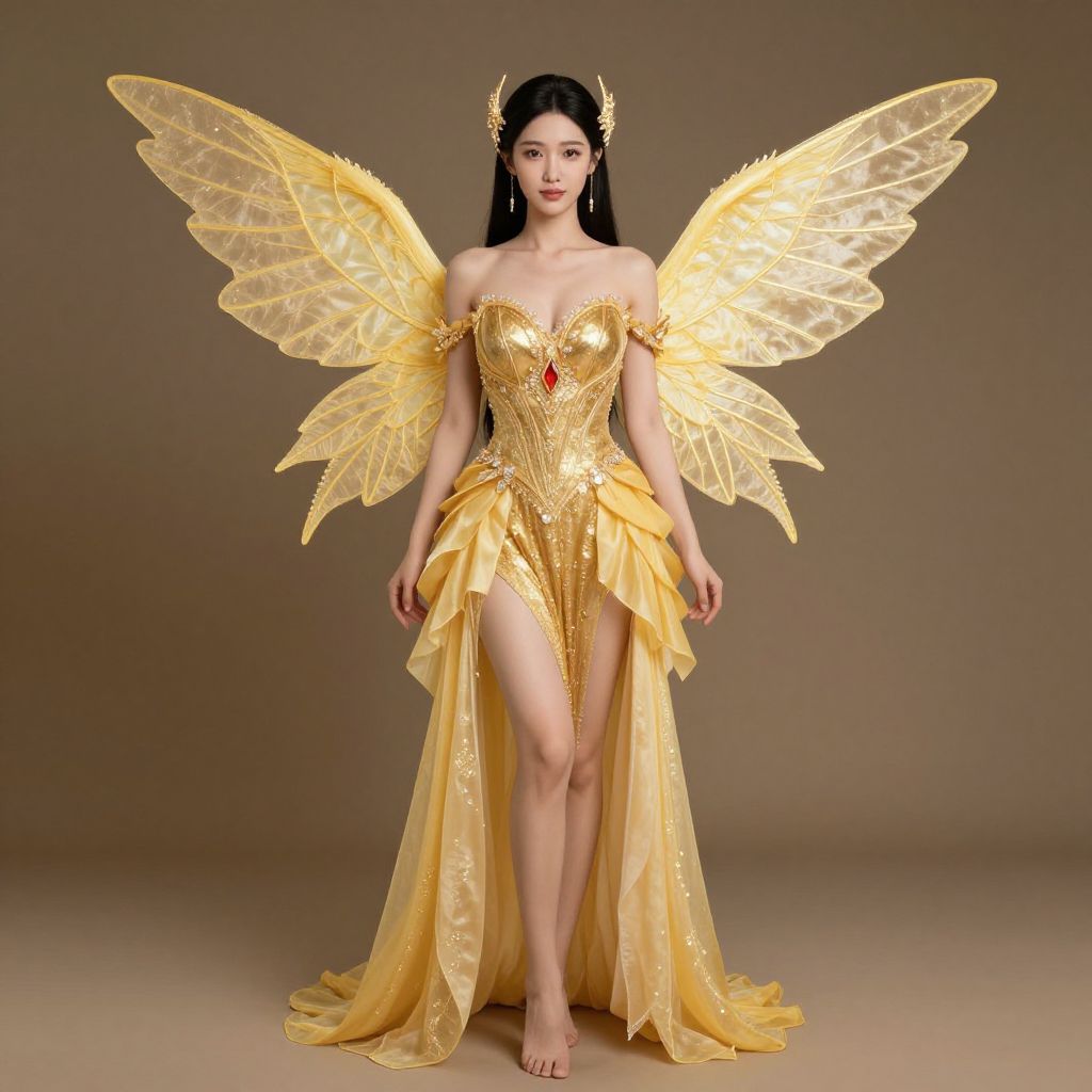 Photograph of an East Asian woman in an elaborate, golden, winged fairy costume with a strapless, off-the-shoulder gown and translucent