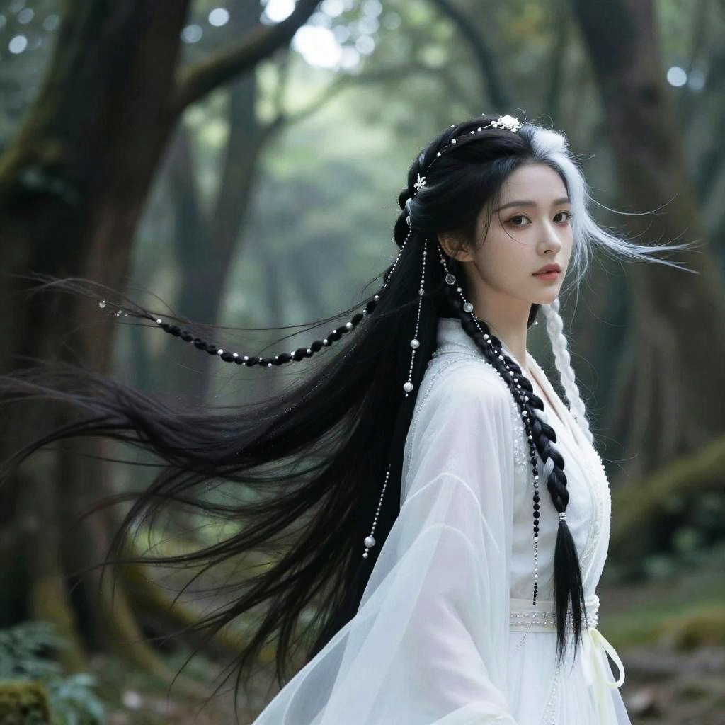 Silvery white hair flowing in the breeze, set against a mystical forest backdrop with shimmering lights, ethereal glow surrounding a serene figure, high detail, fantasy art style, soft pastel colors blending with silver tones, intricate hair strands illuminated delicately.