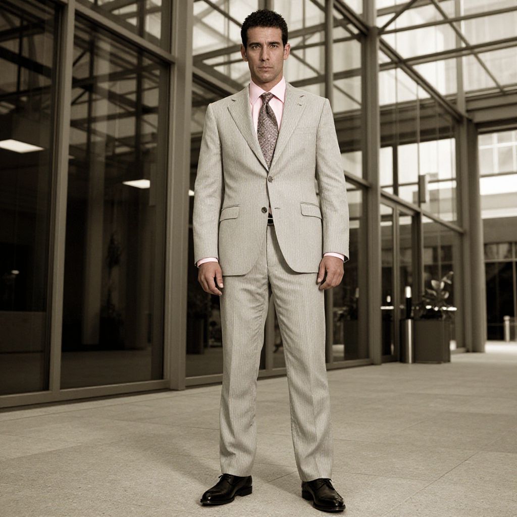 Photograph of a handsome, Caucasian man with short brown hair, wearing a cream suit, white shirt, navy tie, and black shoes, standing confidently