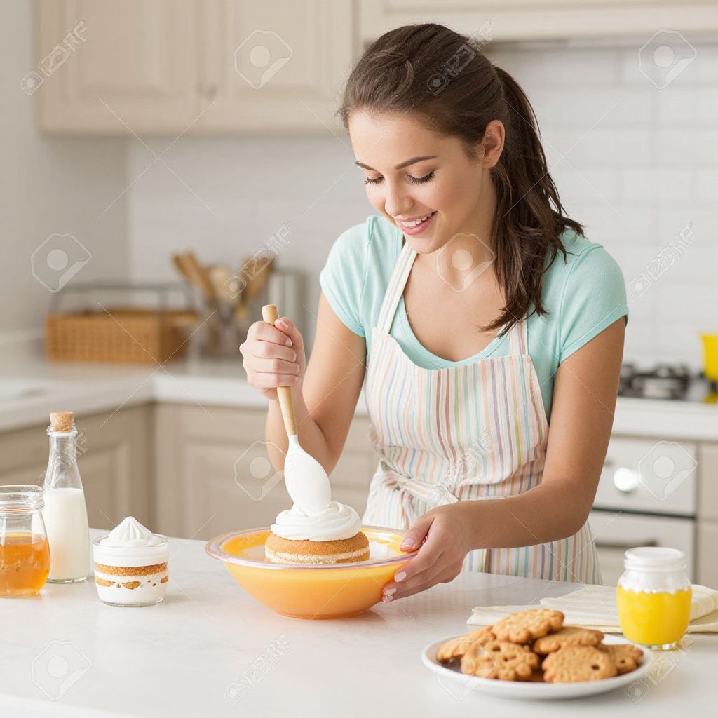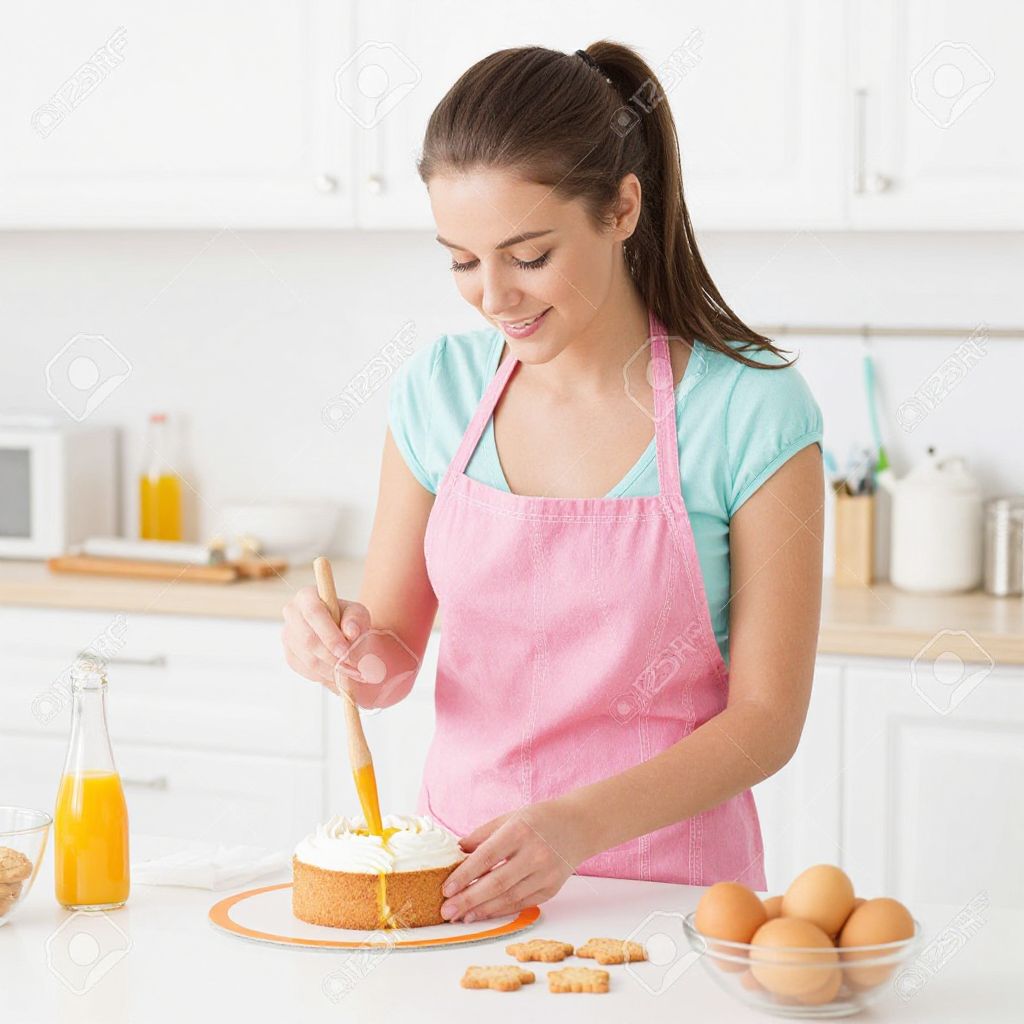 Photograph of a young woman with light skin and dark brown hair in a ponytail, wearing a light blue shirt and pink apron. She is smiling while spreading orange marmalade on a round cake using a knife. The white kitchen background has a blurred orange juice bottle, a bowl of brown sugar cubes, and a bowl with four brown eggs on the white countertop. The image has a bright, clean, and modern feel. The woman's apron is slightly textured, and the countertop is smooth.
