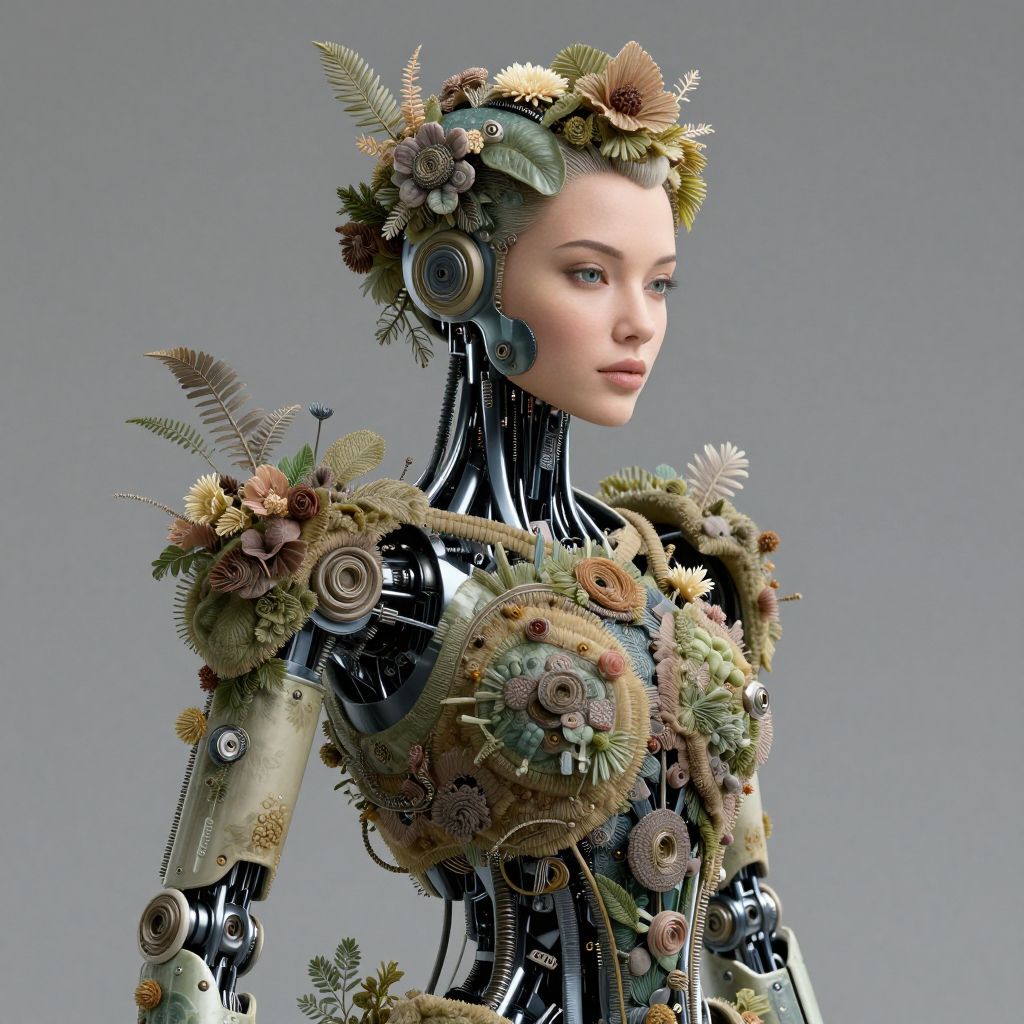 A bionic woman robot adorned with botanical elements, showcasing intricate detailing and a fusion of organic and mechanical components.