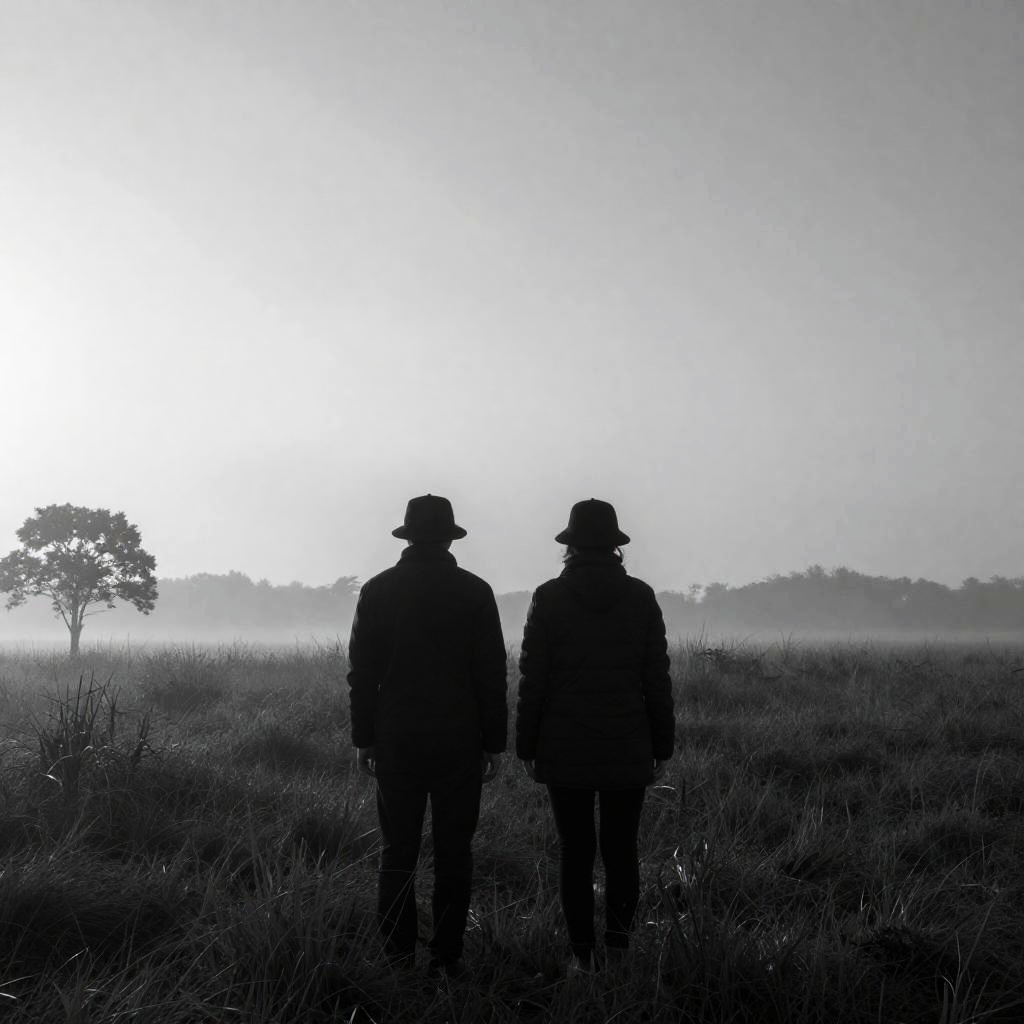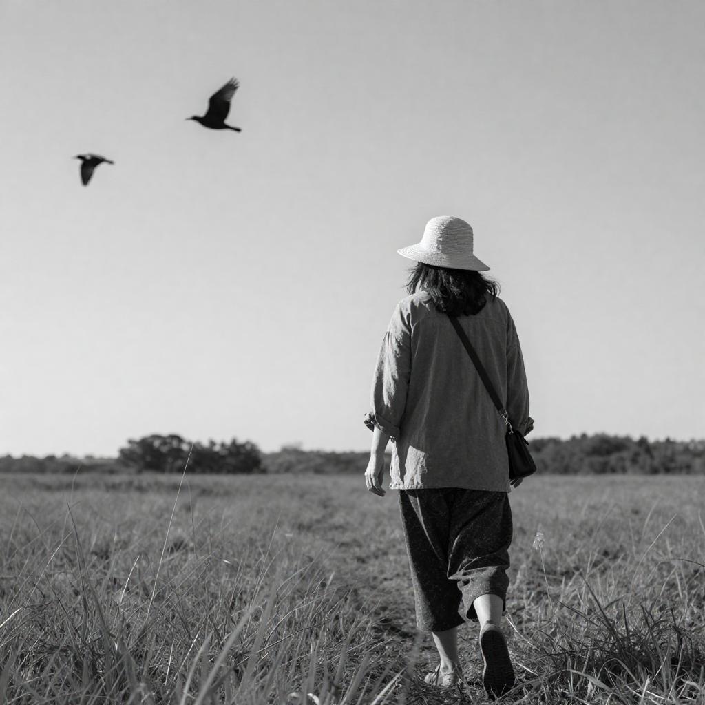 Black-and-white photograph of a lone person with long hair, wearing a wide-brimmed hat, patterned shawl, and layered clothing, walking across a grassy field. Birds fly in the clear sky above. Person's head is slightly bowed, facing forward.