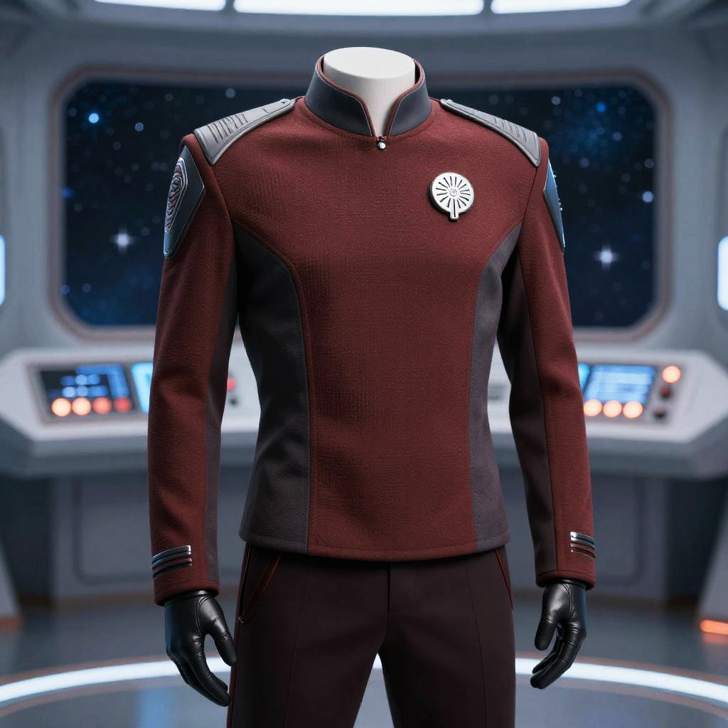 T'Pol costume inspired by classic Vulcan science officer attire, sharp angular shapes, smooth metallic fabric accents, rich textures blending traditional and futuristic elements, backlit by starship control panels in a high-tech environment, cinematic sci-fi illustration style.