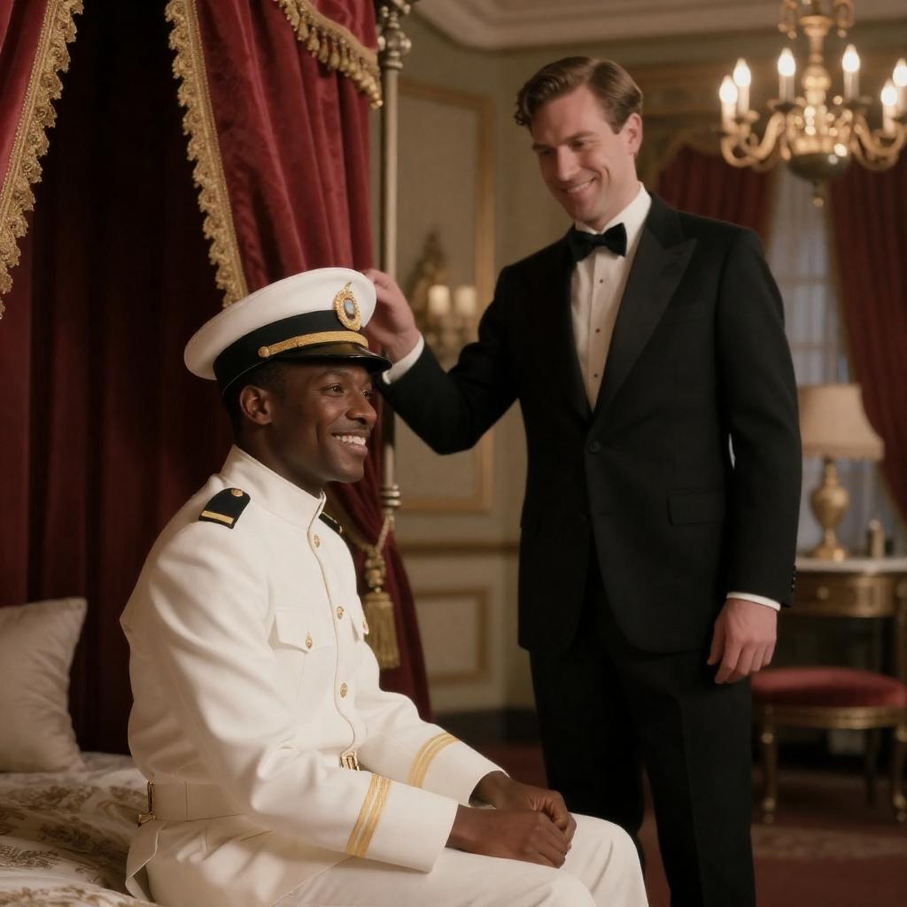 Photograph of three men in historical uniforms. Left man in white hat and dark coat with yellow stripes, middle man in dark military coat with gold epaulettes, right man in black coat and black hat, smiling. Background: bright sunlight, trees. Middle man stands slightly forward, left and right men face him.