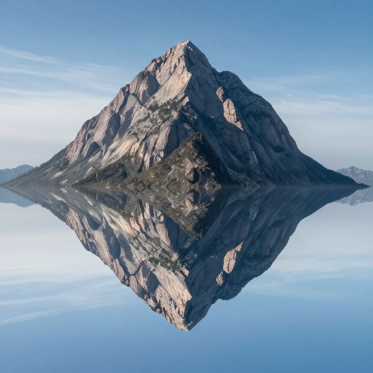 Photograph of a solitary, jagged mountain peak with a reflective, glass-like surface below, creating a mirror image. The mountain, with rocky textures in shades of brown and gray, stands against a clear, bright blue sky. Light reflects off the calm, mirror-like water surrounding the mountain, enhancing the symmetry. The background includes faint, white cloud streaks and distant, hazy mountain ranges, adding depth to the serene, natural landscape. The image emphasizes the mountain's sharp, rugged edges and the tranquil, reflective water.