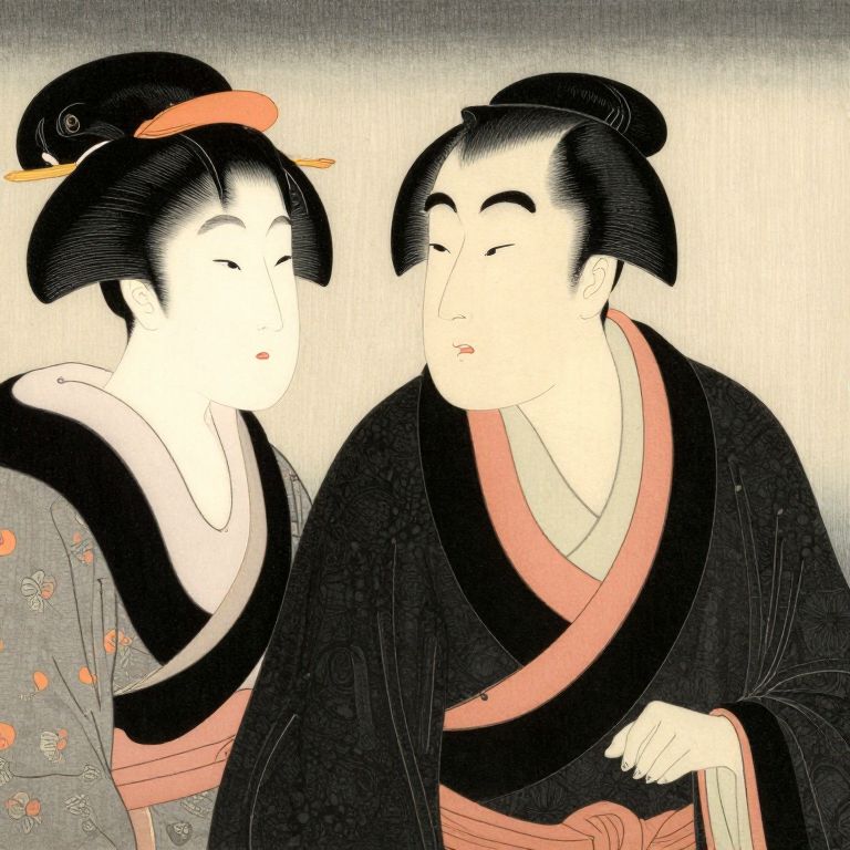 Triangle Une estampe japonaise, ukiyo-e, montrant un homme européen, rire, avec une femme japonaise, 4k,