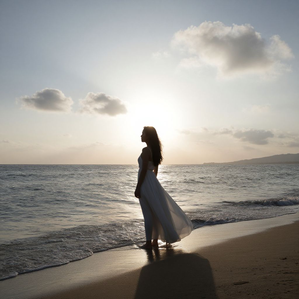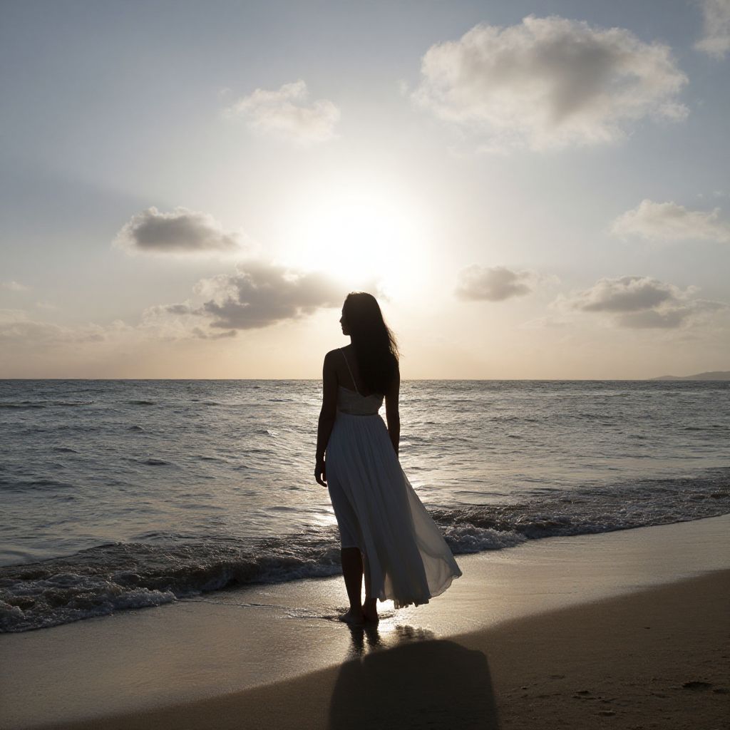 Silhouette of a woman in a flowing white dress stands contemplatively on a sandy beach as waves gently lap around her feet, with the sun breaking through clouds above, casting a serene glow over the horizon.