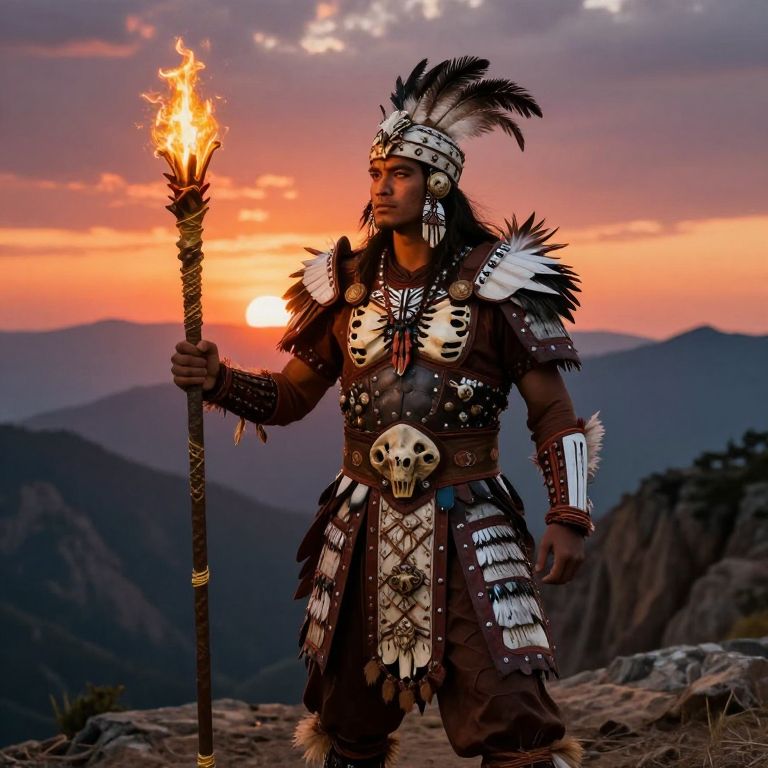 Photograph of a Native American warrior standing on a rocky mountain ledge during a vibrant sunset. He has a muscular build, long black hair, and wears a feathered headdress. His armor is adorned with metallic plates, feathers, and a prominent skull belt. He holds a burning torch in his right hand. The background features a colorful sky with orange and purple hues, and distant, shadowy mountain ranges. The warrior's dark brown and black attire contrasts with the bright sky, and his intense gaze is directed to the horizon. The image evokes a sense of bravery and ancient culture.