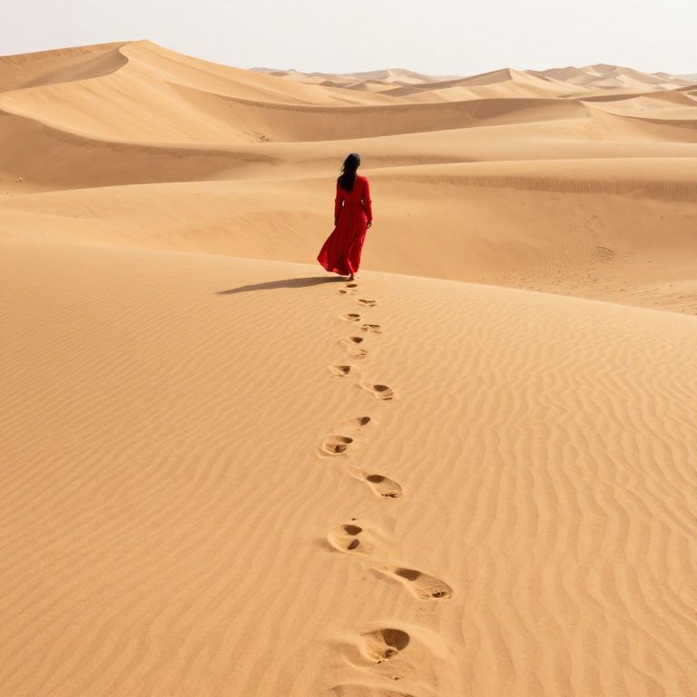 Photograph of a vast, sunlit desert with undulating sand dunes in warm orange hues. A lone figure, a woman with dark hair, stands in the center, dressed in a flowing, vibrant red robe. She is facing away, walking along a trail of her footprints that lead from the foreground to her. The sand has rippled textures, and the sky is bright white, creating a stark contrast with the golden dunes. The image evokes a sense of solitude and tranquility in the expansive, arid landscape.