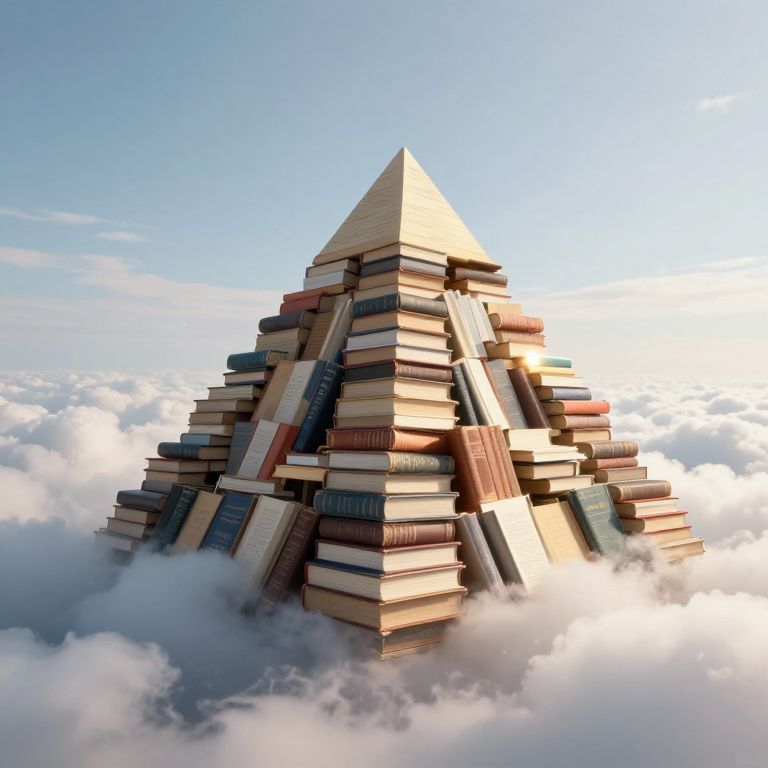 A towering, gravity-defying pyramid of books floats serenely amidst a sea of fluffy clouds, its pages shimmering with ethereal light as if whispering secrets to the heavens.