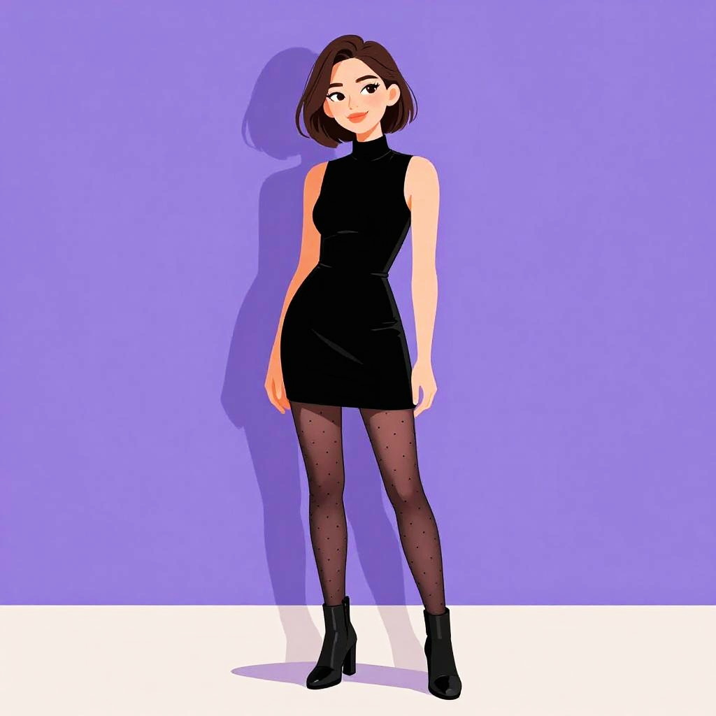 Digital illustration of a young woman with a fair complexion and short, dark brown bob haircut. She wears a sleeveless, black, high-neck mini dress, black polka-dot tights, and black high-heeled ankle boots. Her expression is neutral, with light pink lipstick and subtle eye makeup. The background is a solid, bright purple, and she stands on a white floor, casting a shadow to her left. The art style is modern and minimalist, with bold colors and clean lines.