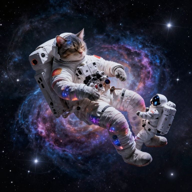 Colossal feline, composed of swirling galaxies and stardust, peacefully naps across the shoulders of a lone astronaut drifting through the cosmic void, its fur aglow with celestial light.