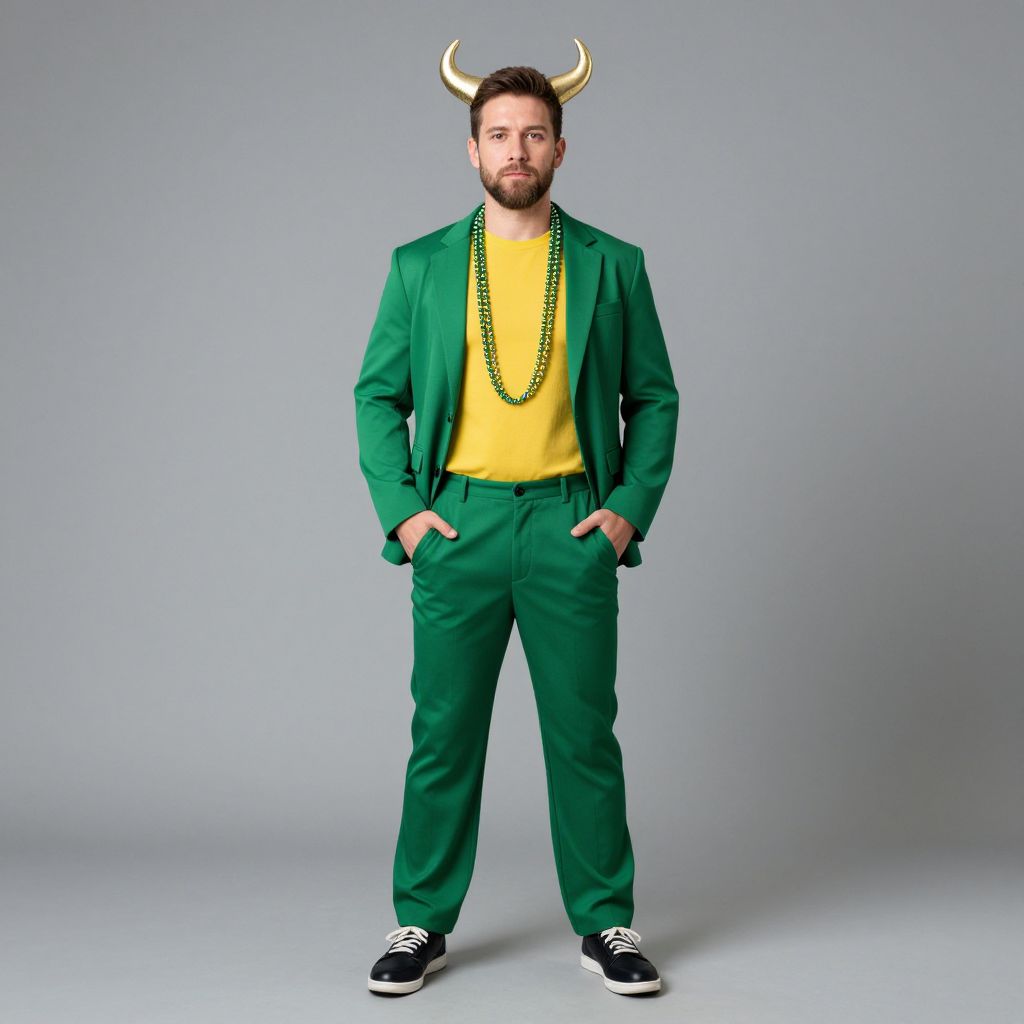 Photograph of a bearded man with short brown hair, standing against a plain grey background. He wears a green suit with matching green pants and a yellow shirt underneath, accessorized with a long green bead necklace. He has on black and white sneakers and sports a playful look with golden horn headgear. His hands are casually placed in his pockets, and he gazes directly at the camera with a neutral expression. The image has a clean, studio-like quality with even lighting.