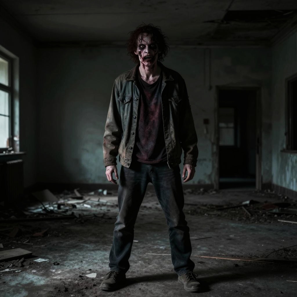 A full-length photo of a man exuding a zombie-like aura with a menacing look in an eerie, dimly lit, abandoned interior, invoking a sense of horror and suspense.