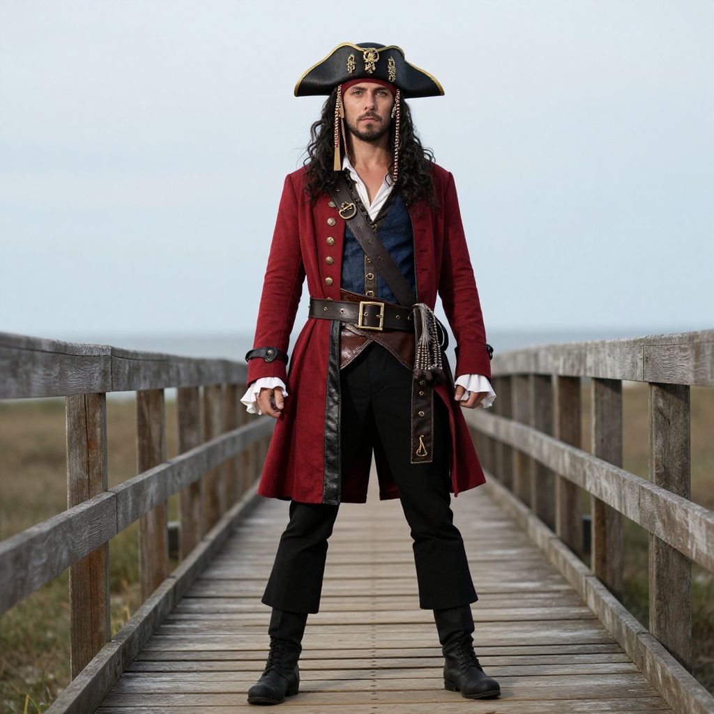 Modern Day Pirate Costume, pirate in red coat and hat standing on a walkway