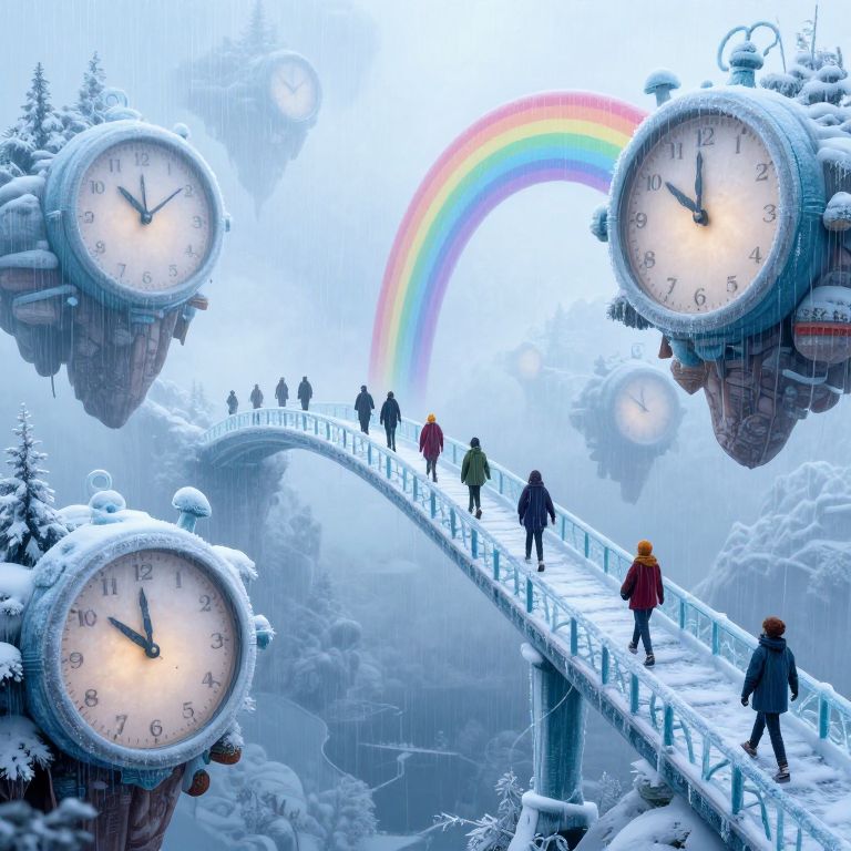 This digital artwork depicts a surreal winter scene. A snowy, foggy landscape features a snow-covered, arched bridge with blue railings. Six people, dressed in colorful winter clothes, walk across the bridge towards a vibrant rainbow in the misty sky. Three large, floating, snow-covered clock faces, each showing a different time, hover above the bridge. Snow-covered trees and fog add depth to the background. The clocks and bridge are detailed with realistic textures, while the rainbow adds a bright, colorful contrast to the otherwise muted, icy palette. The overall style blends realism with fantasy elements.