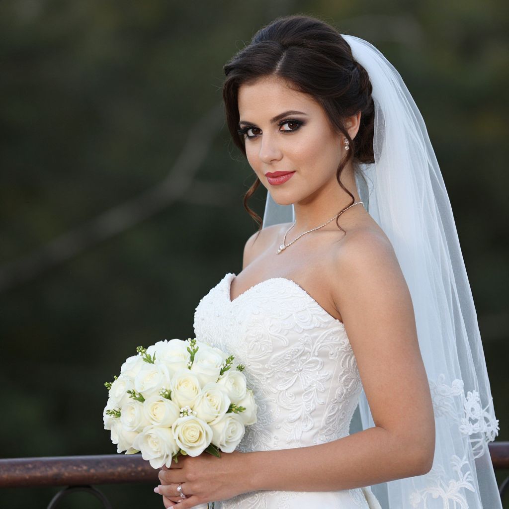 Photograph of a beautiful South Asian bride with medium brown skin and dark brown hair styled in an elegant updo. She wears a white, strapless, textured wedding gown with a fitted bodice and holds a bouquet of white roses. A long, sheer white veil drapes over her shoulders. She has dark, defined eyebrows, bold black eyeliner, and bright red lipstick. She wears small, dangling earrings and a delicate necklace. The background is blurred with dark green foliage, emphasizing the bride. The image has a soft, natural light, highlighting the bride's features and attire.
