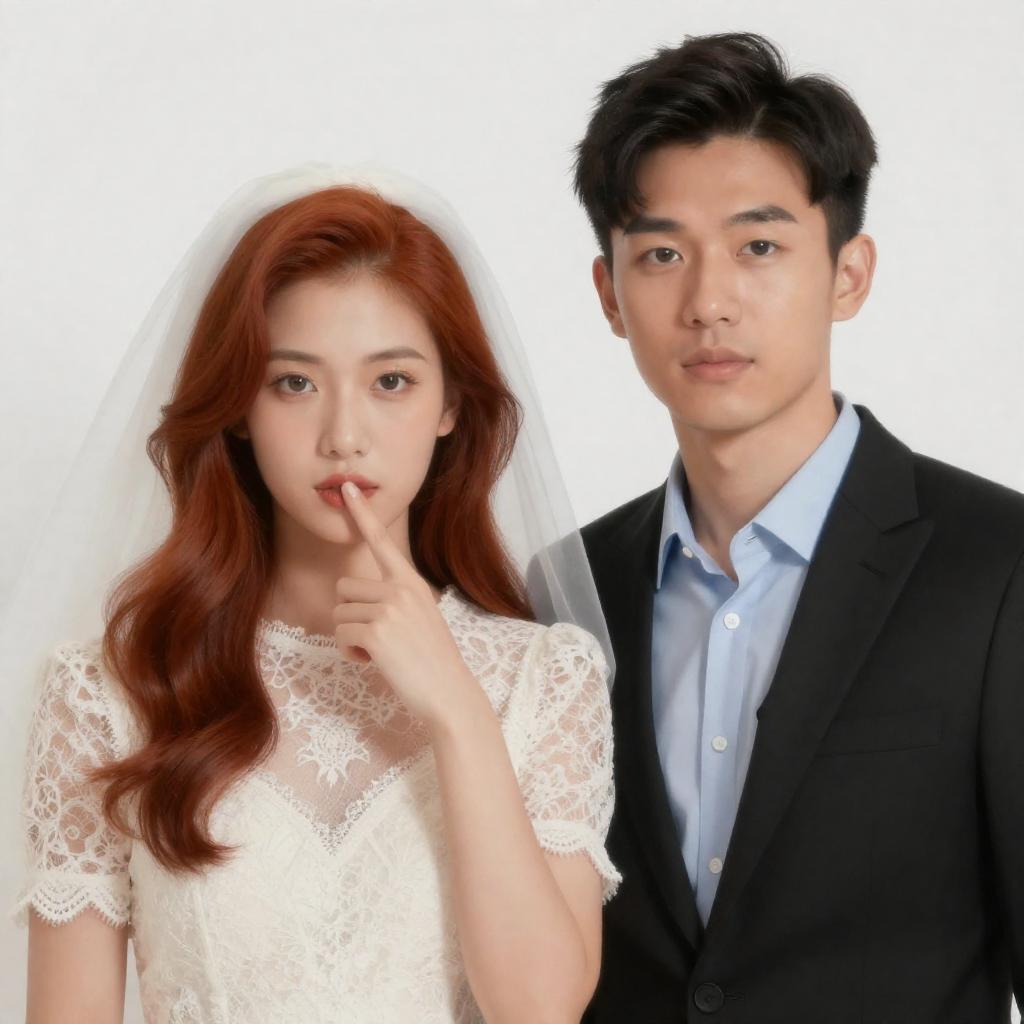 Photorealistic painting of a man and woman. Woman with red hair, white veil, and lace dress, pointing finger to lips. Man with black hair, black suit, blue shirt, looking forward. White background, couple close together.