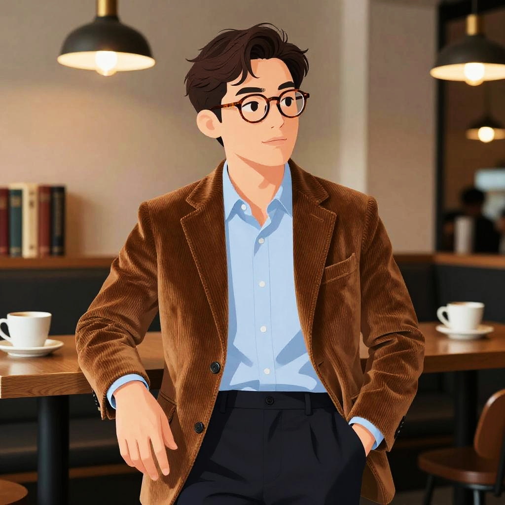 Stylish young man, casual olive green bomber jacket layered over charcoal hoodie and dark jeans, hipster cafe with exposed brick walls and ambient string lights; contemporary glam, large silver hoop earrings, long wavy hair, confident fashion pose, photorealistic, high-fashion editorial feel, glossy skin highlights, tasteful makeup, clean minimal styling, shallow depth of field, rim-lit edges, soft shadows, cinematic color grade, crisp fabric texture, balanced composition, subtle lens flare, studio polish, sharp focus. --sref 1467