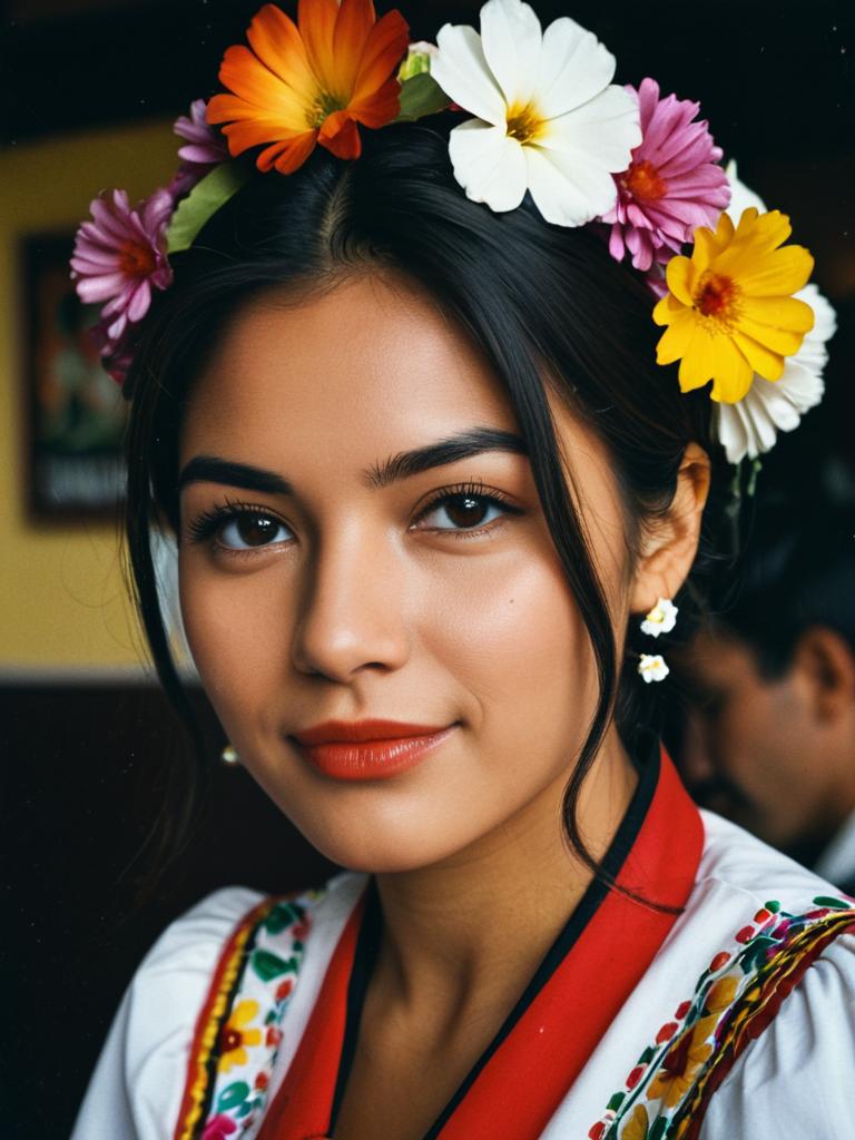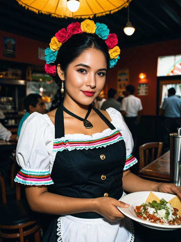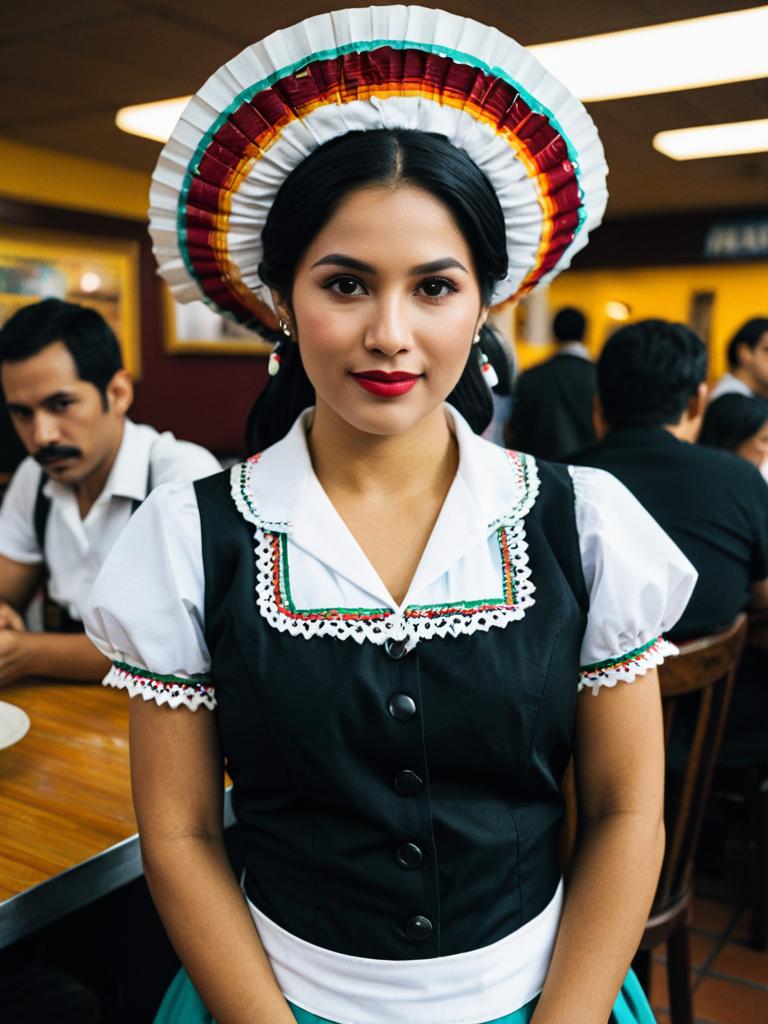 Woman in Mexican Waitress Costume, cosplay festival portrait, photorealistic realism