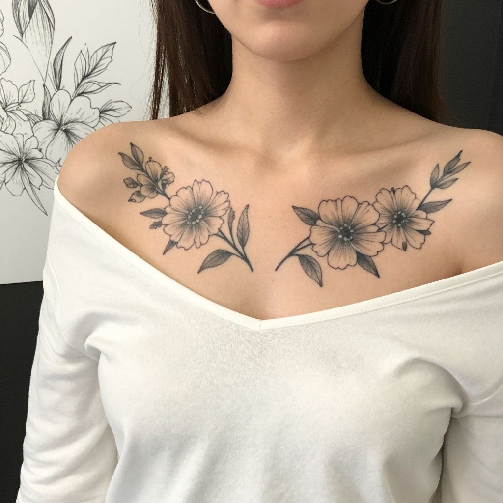 This image shows a close-up of a woman's chest and shoulder. She has a detailed black ink tattoo of flowers with leaves on her upper chest. She's wearing a white, off-shoulder top with a soft texture. Her skin is light, and she has small, hoop earrings. On the left side, there's a black and white sketch of similar floral designs. The photo has a casual, candid feel.