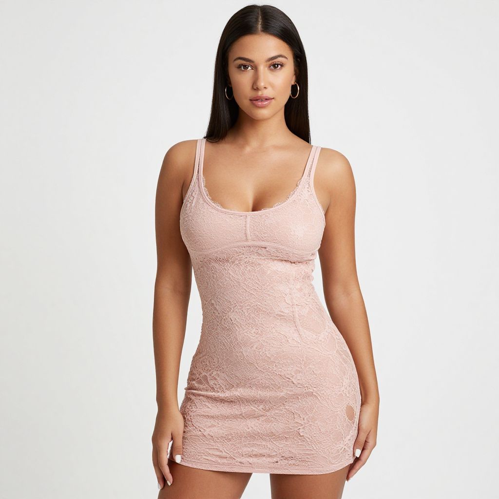 Photograph of a confident woman with long black hair, wearing a form-fitting, pink lace tank dress, standing against a plain white background.