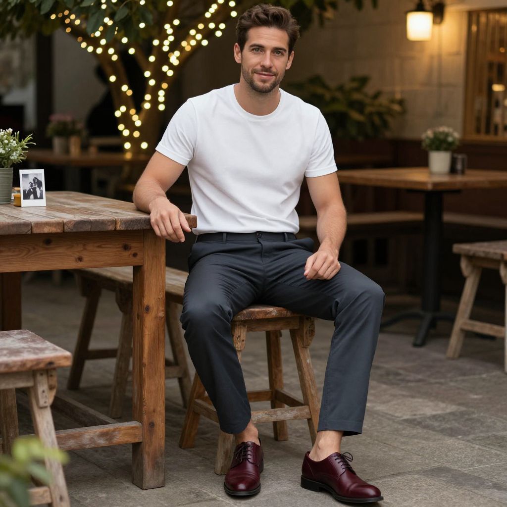 A man, white henley shirt, charcoal dress pants, burgundy leather shoes, slim-fit style, lightweight cotton, charming bistro patio, twinkling fairy lights, rustic wooden tables, vintage photo, relaxed smile, warm ambiance. Man has masculine face and piercing eyes