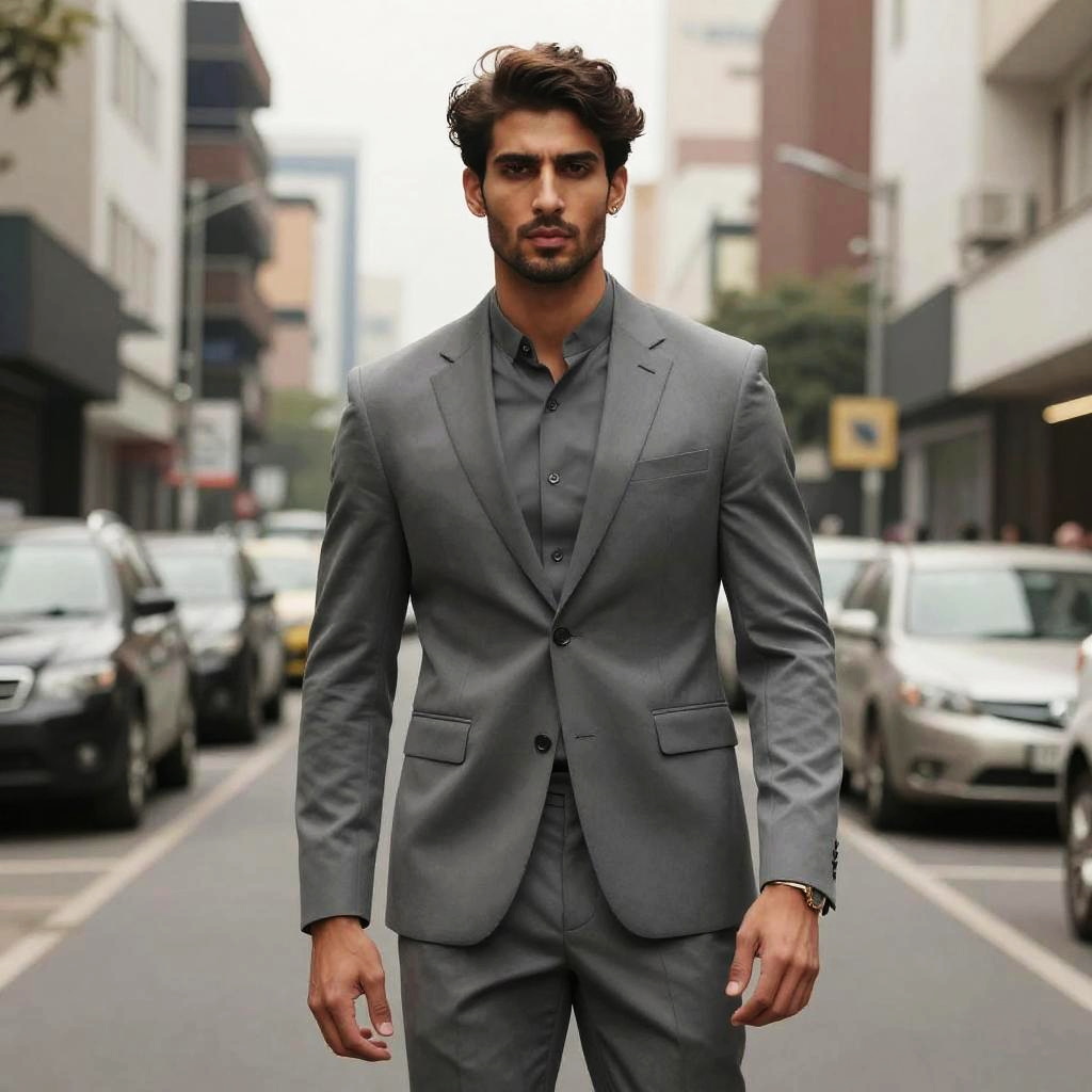 Mexican male model wearing contemporary high fashion attire, studio setting with dramatic lighting and shadows, intense gaze, sleek hairstyle, editorial style photography