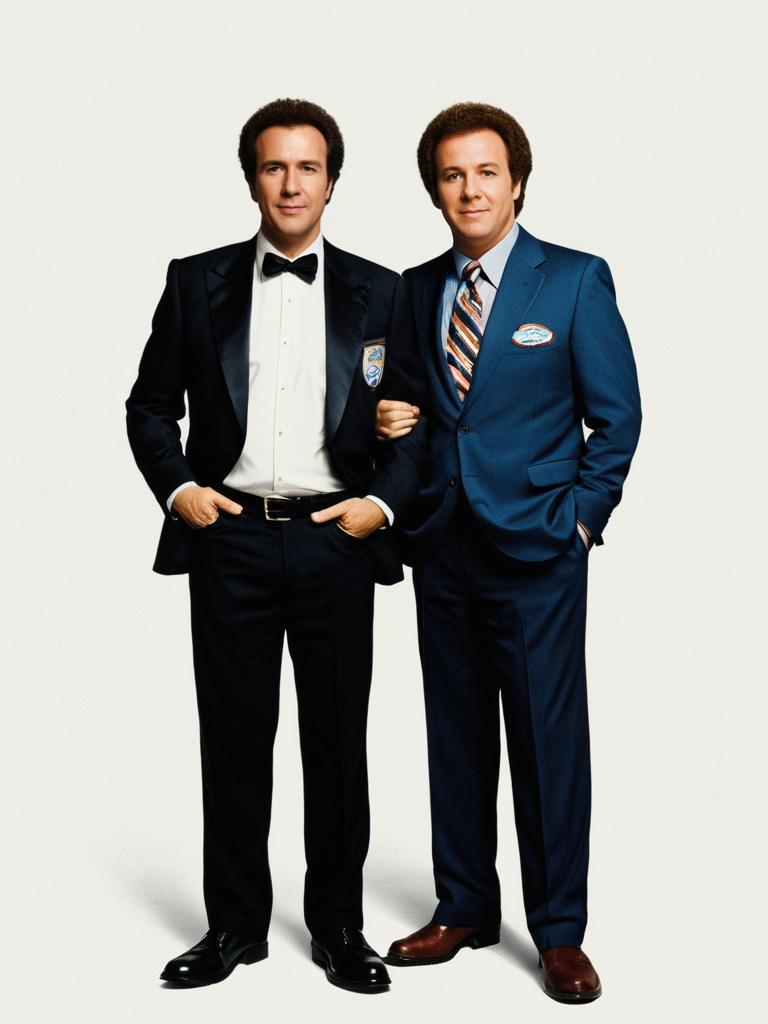 Photorealistic studio portrait of two men dressed in Step Brothers movie character costumes. Both men have curly hair and wear plaid shirts with blue overalls. The gentlemen are posing against a dark background with one pointing a finger and both smiling, evoking comedic realism.