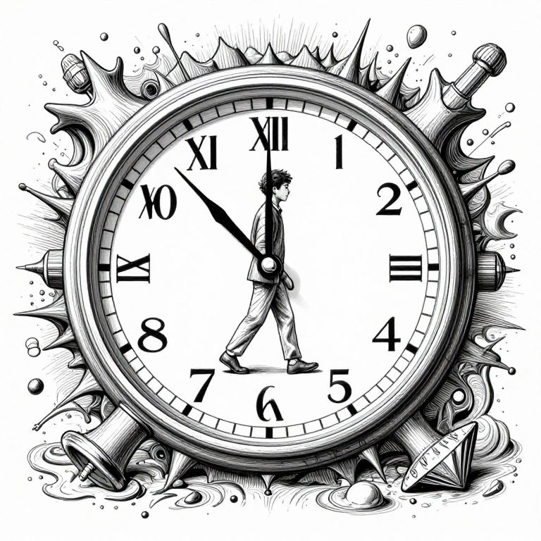 Time Dilation person walking around a circular clock. exploded. hyper-detailed, insane details, intricate details. coloring page,