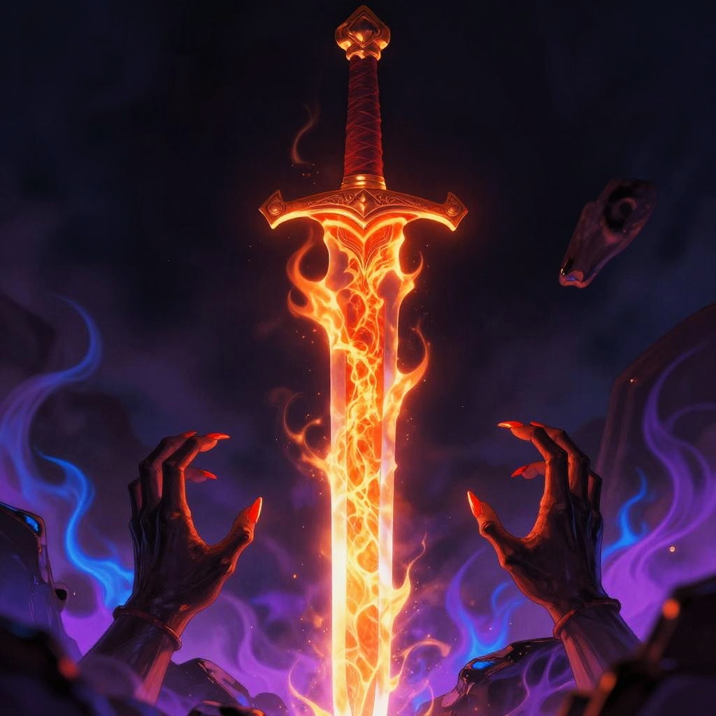 Digital artwork of a glowing, fiery sword standing upright, surrounded by intense blue and purple flames. The sword's blade is bright orange, resembling molten lava, while its hilt and guard are dark and ornate. Two black, claw-like hands with red glowing tips reach up from the bottom, gripping the sword. The background is dark and smoky, enhancing the fiery effect.