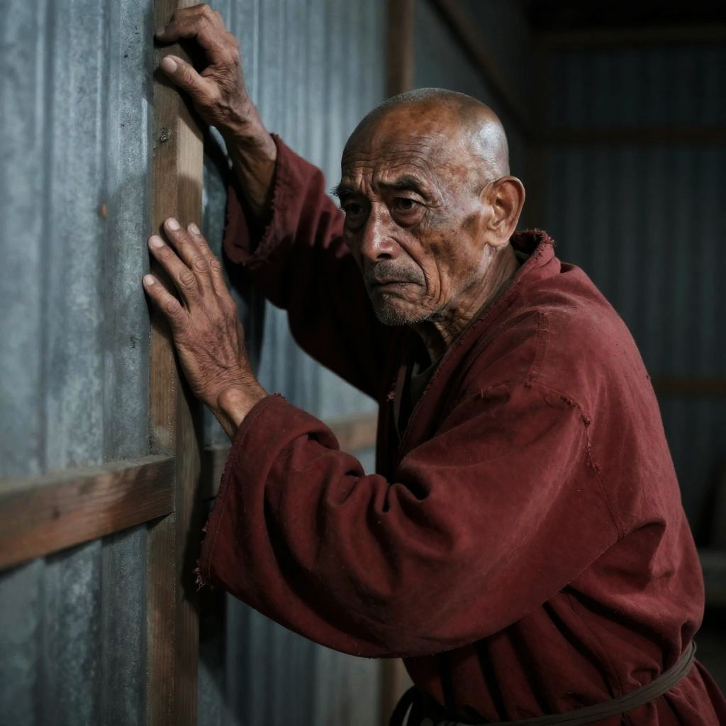 A grimy, bald, elderly man with wrinkled skin, wearing tattered red robes, clings to a wooden wall, hands pressing against it. His face shows intense strain. Background: corrugated metal wall, dim lighting, industrial setting.