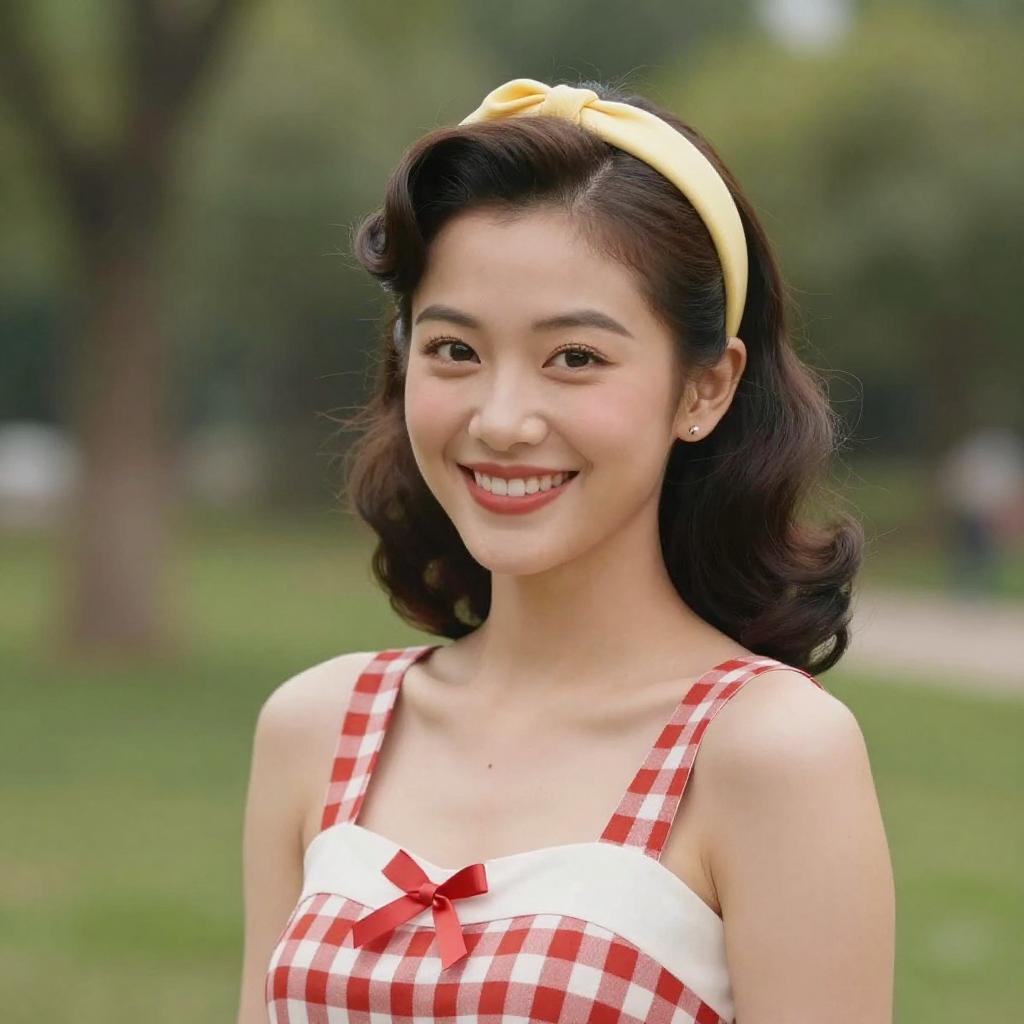 Portrait of a cheerful young Asian woman wearing a red and white checkered vintage-style dress with a red bow and a yellow headband. She has styled retro wavy hair and is smiling brightly, standing in a green park setting with blurred trees in the background.