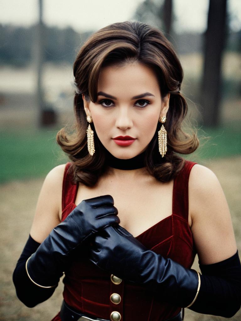 Portrait of a woman with brown hair and brown eyes wearing a vintage-inspired burgundy velvet dress with gold buttons, long black gloves, chandelier gold earrings, and a black choker. She is standing outdoors with a blurred background.