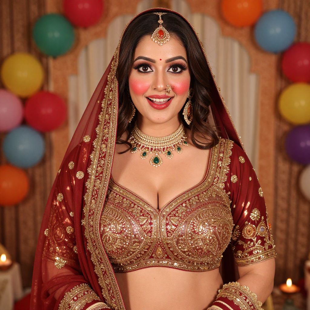 A close-up portrait of a woman in a dazzling palazzo lehenga costume with shimmering gold and crimson fabrics, standing in front of a traditional Indian festival backdrop with colorful balloons and diyas, her face bright and animated, with bright red cheeks, expressive eyes, and a warm smile, showing confidence and elegance.. The woman has big tits and cute face