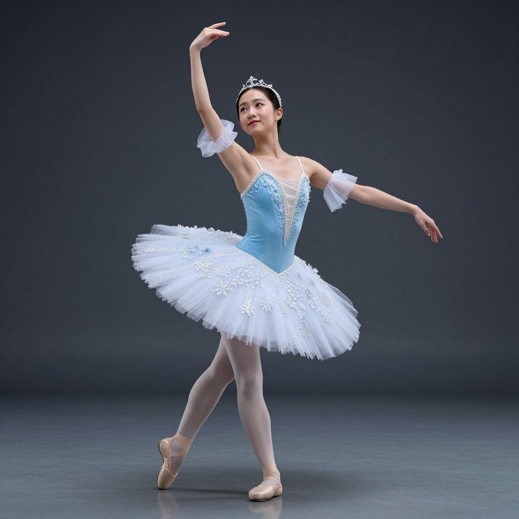 Photograph of a young Asian ballerina in a blue and white tutu, tiara, and pointe shoes, gracefully dancing against a dark