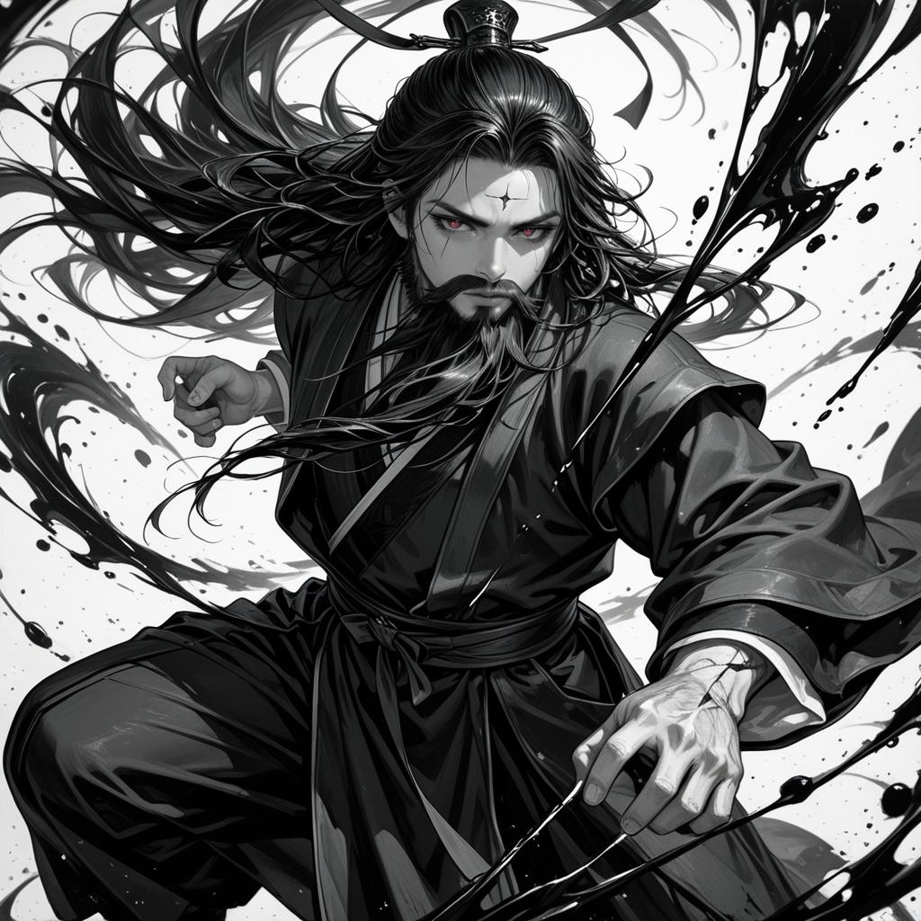 Monochrome, ink sketch, 1boy, asian (middle age man), (long beard, facial hair), fighting stance, looking at viewer, long hair, floating hair, hanfu, chinese clothes, long sleeves, (abstract ink splash:1.2), white background