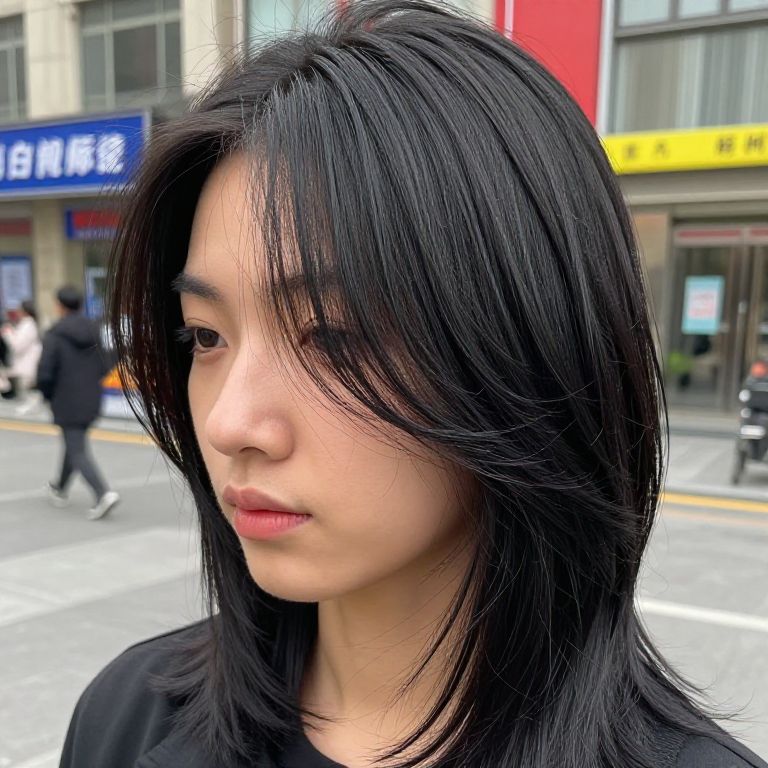 Comma haircut close-up, sleek black hair styled with a soft inward curl at the ends, glossy and smooth strands framing a delicate face, modern Asian street fashion background, natural makeup, vibrant urban vibe, high detail, sharp focus.
