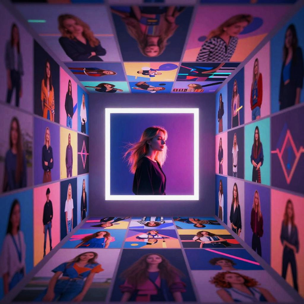 Photograph of a brightly lit, narrow corridor with vibrant, colorful panels on the walls and floor, each featuring photographs of young women in various outfits and poses. The panels are illuminated by pink, blue, and purple lighting, creating a neon effect. At the center of the corridor, a large, glowing white square frames the silhouette of a woman with long hair, facing slightly to the right. The overall scene has a modern, almost futuristic aesthetic, with a strong emphasis on light and color contrasts. The women in the photographs have diverse hairstyles and fashion styles.