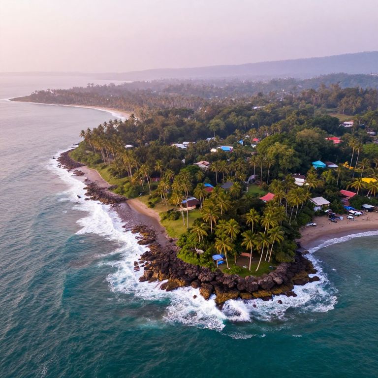 Aerial photograph of a small, tropical island with a narrow sandy shore curving along the edge. The island is densely populated with tall, green palm trees and colorful houses with red, blue, and yellow roofs. The shoreline is bordered by dark rocks, with white, foamy waves crashing against them. The island is surrounded by calm, deep blue ocean, and the background shows a misty, hilly landscape stretching into the horizon under a soft, pastel pink and purple sky. The overall scene is vibrant and picturesque.
