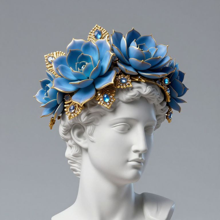 A digitally rendered headpiece crafted in a surreal, fantasy-inspired style features vibrant blue succulent-like flowers adorned with intricate gold detailing and sparkling gemstone accents, creating a striking contrast against the smooth, classical bust of a mannequin, showcasing a blend of natural and opulent elements in a high-definition, computer-generated artwork.