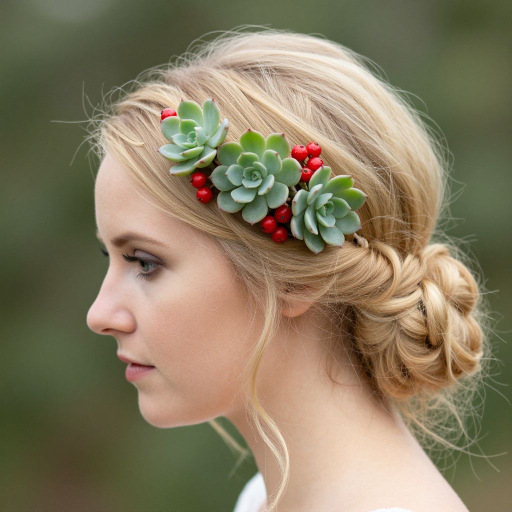 Blonde woman wearing a delicate berry succulent floral headband, featuring vibrant green succulents and red berries, styled elegantly atop her updo hairstyle, showcasing natural bridal accessories by Pine and Petal Weddings.